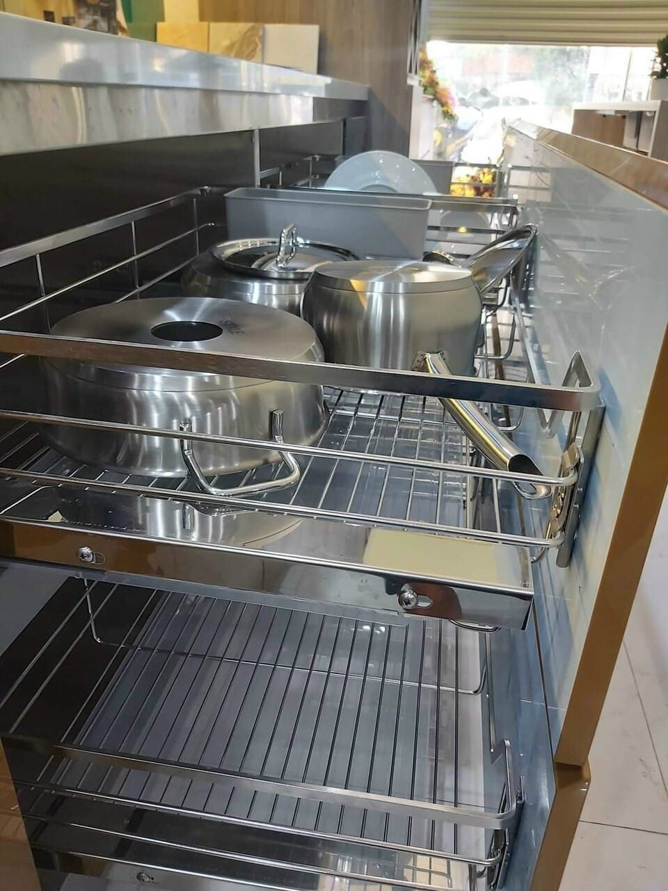 Giá để bát đĩa - xoong nồi tủ dưới nổi bật ở chất liệu inox bền đẹp. Được kết hợp với bộ ray giảm chấn giúp chuyển động mượt mà và ổn định.